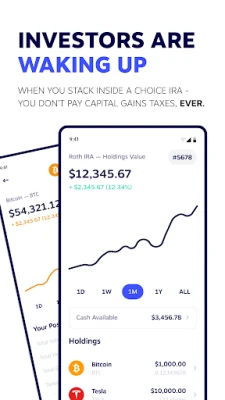 When you open a Choice Account, you are opening an Individual Retirement Account -- an IRA for short. Investing in an IRA means you pay NO CAPITAL GAINS TAXES. You read that right, while you are building your bitcoin stack or trading stocks and other crypto from a Choice IRA - you don't pay any capital gains on your trades or investment returns.